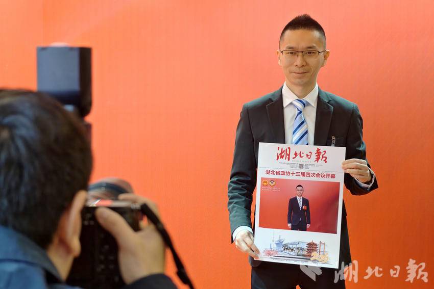 1月26日,武汉洪山礼堂大厅内湖北日报两会互动区热闹非凡,邀请代表委员拍摄定制化湖北日报头条版面照片,用光影定格履职瞬间。(湖北日报全媒记者 陈少哲 摄)