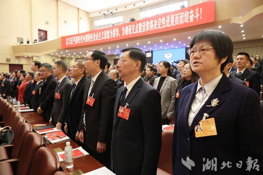 1月26日,省政协十三届四次会议开幕会现场,委员们起立奏唱国歌。(湖北日报全媒记者 陈少哲 摄)