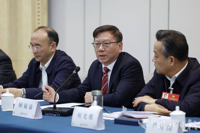 在社会科学界小组会议上,省政协委员顾敏康(中)发言。(湖北日报全媒记者 陈少哲 摄)