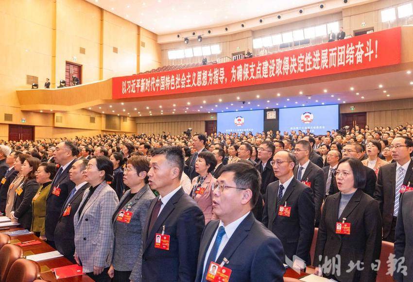 1月26日,湖北省政协十三届四次会议开幕大会现场,全体起立唱国歌。(湖北日报全媒记者 薛婷 摄)