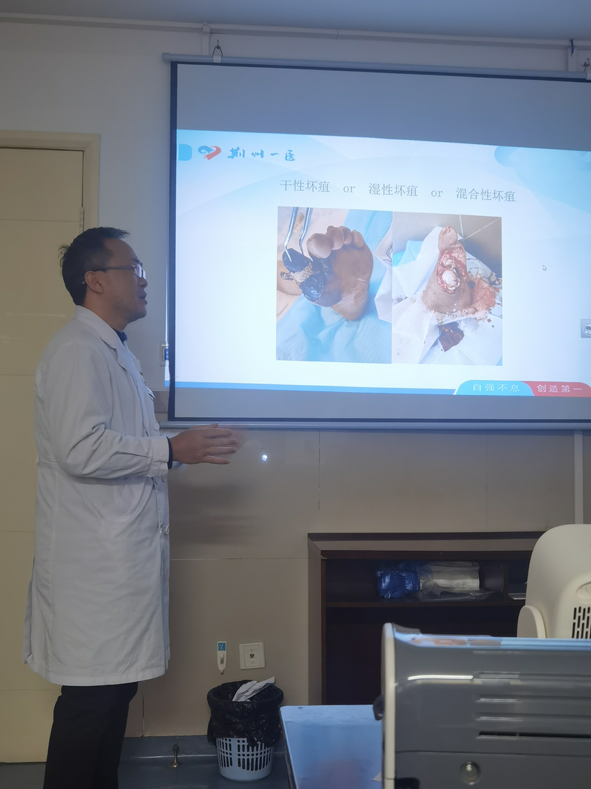 交流会伊始,介入血管外科副主任黄必润率先致辞,强调多学科协作(MDT)模式在糖尿病足防治中的核心价值,指出下肢动脉血运重建是挽救濒危肢体、降低截肢率的关键。作为周围血管疾病诊疗资深专家,他结合大量临床案例,深入浅出解析了不同类型坏疽患者的血运评估标准与重建策略,明确血运重建对创面愈合、肢体功能保留的重要意义,为临床精准决策提供了宝贵经验,让在场医务人员对“保肢战机”的把握形成更深刻认知。