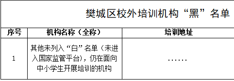 湖北日报讯(记者魏鹏、通讯员聂志鹏)1月27日,襄阳市樊城区发布《关于2026年寒假校外培训致家长的一封信》,提醒广大家长在寒假期间审慎对待且谨慎选择校外培训,维护孩子合法权益,让孩子们度过一个平安、愉快、健康、温馨、有意义的假期,同时公布了1月份校外培训机构“白、黑”名单。