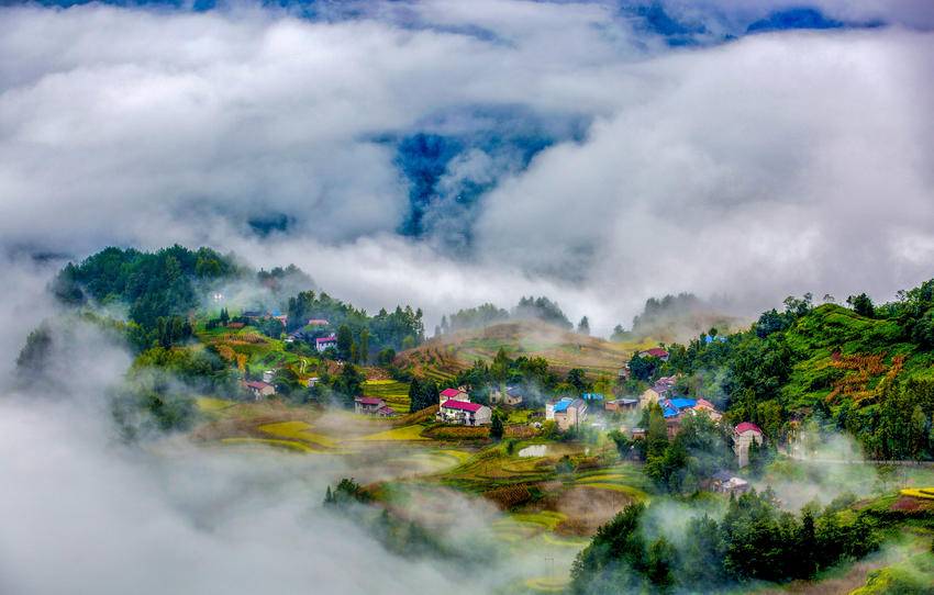 湖北利川国家级文物保护单位鱼木寨,云海深处的鱼木寨村。