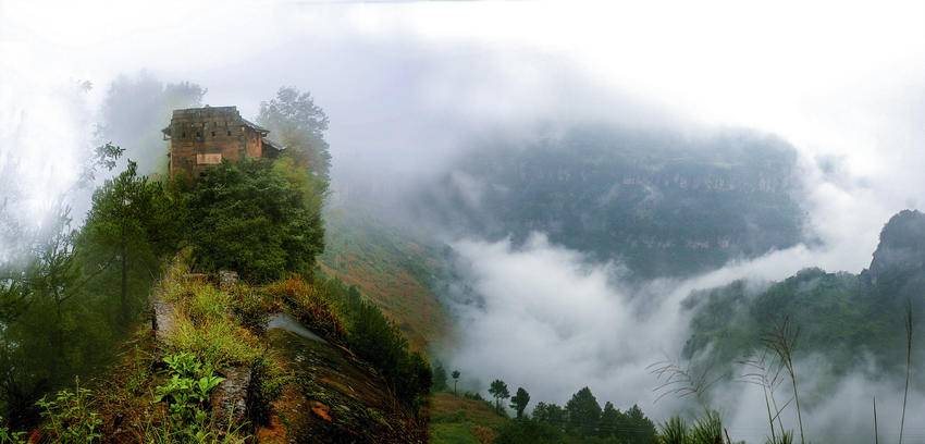 湖北利川国家级文物保护单位鱼木寨,雨后云雾缭绕十分神秘。