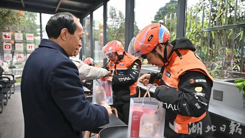 “平时我们比较忙,单子一多,连口水都没时间喝。今天天气冷,能进工会驿站里倒杯热茶喝,感觉又暖手又暖胃,一下子感觉浑身都有劲了。今天还领到一份大礼包,这种感觉就像被人惦记着,放在心上的感觉,心里特别暖,特别踏实。”前来休息的外卖员苏贤士说道。