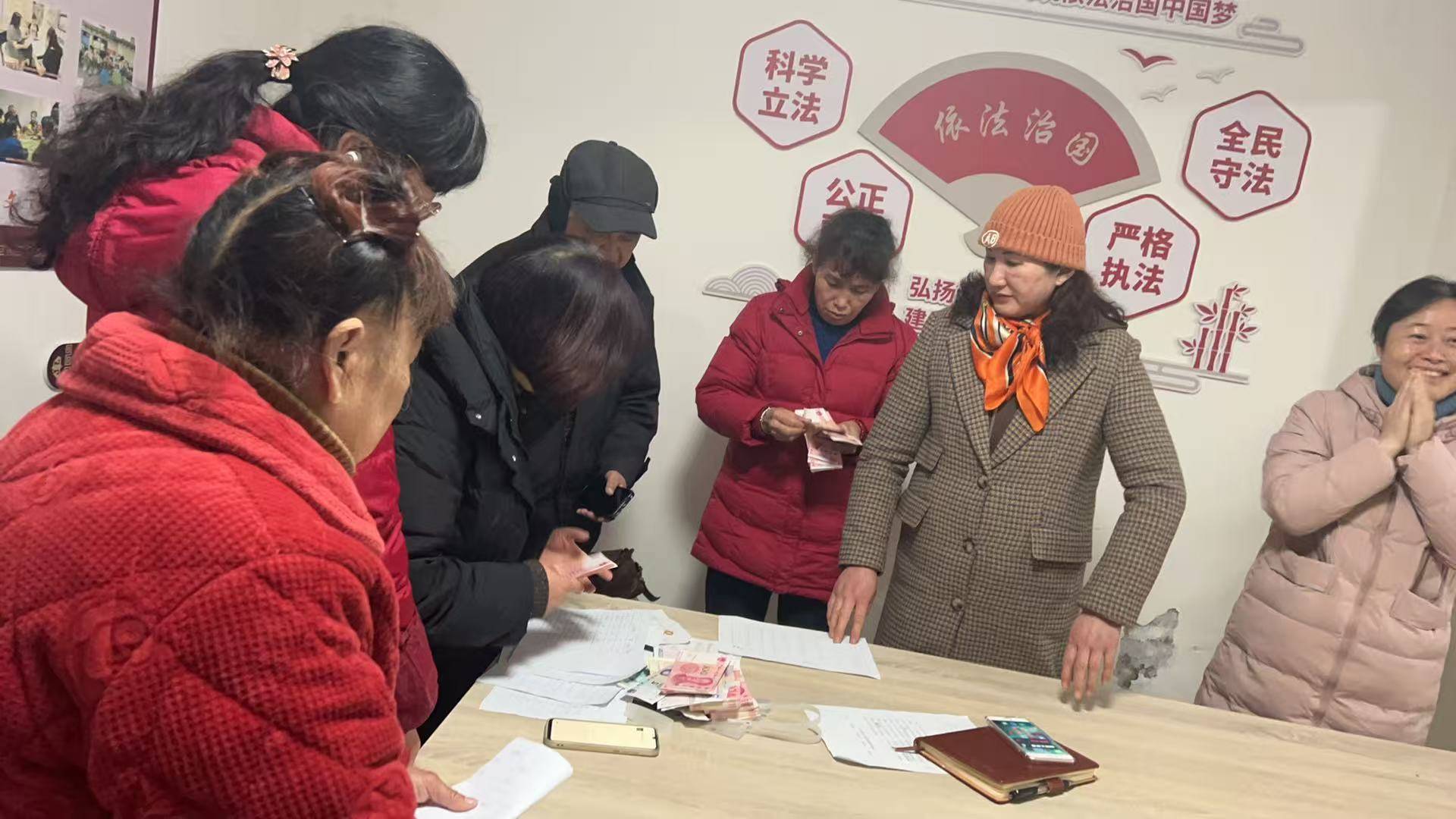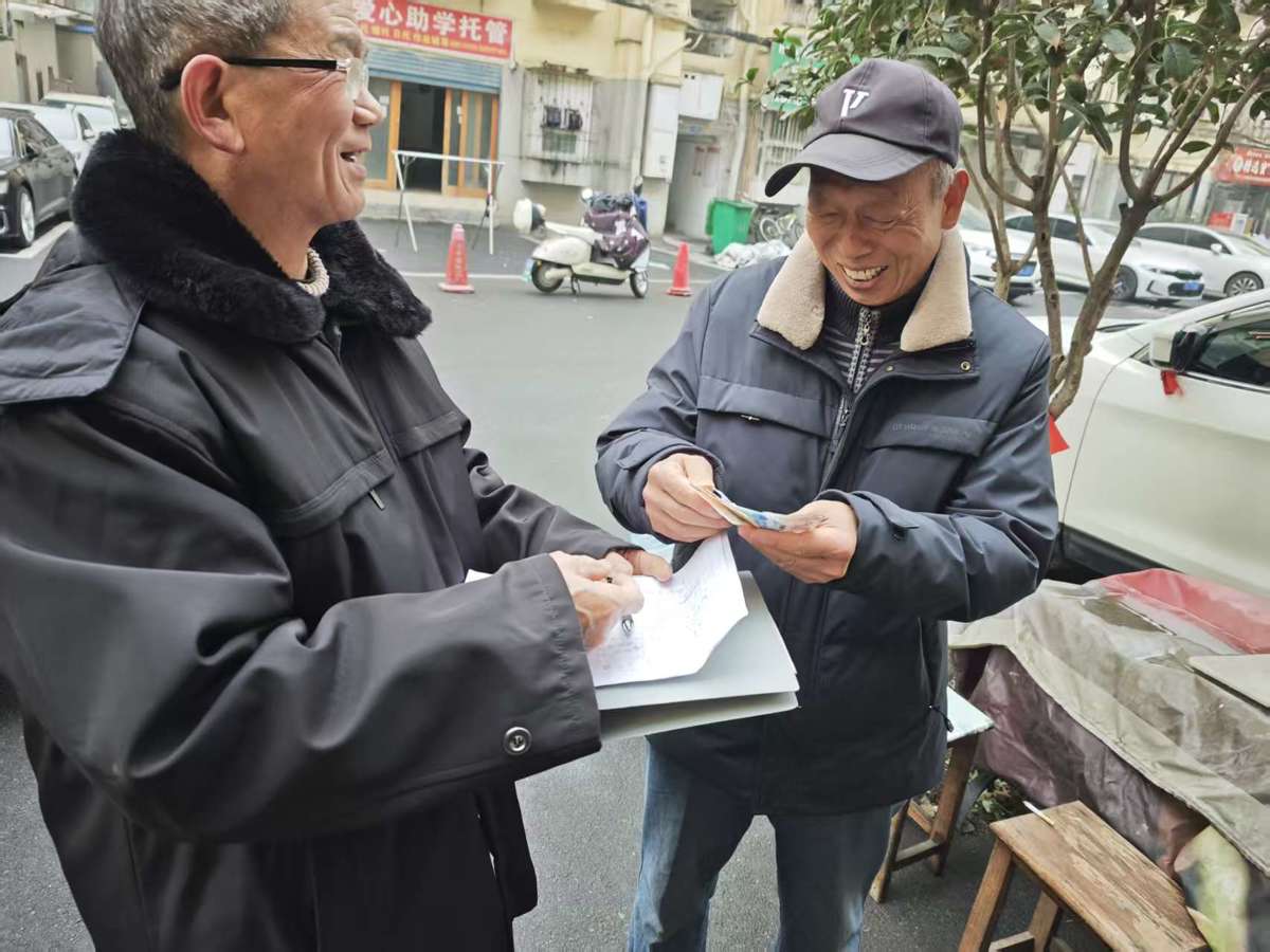 何光银主任(右)为业主毛树斌发放福利。(采访对象供图。)