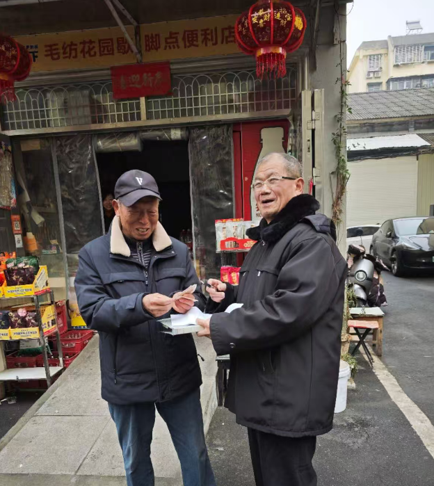 毛纺花园小区业主委员会主任何光银(左)给业主毛树斌发放福利。(采访对象供图。)