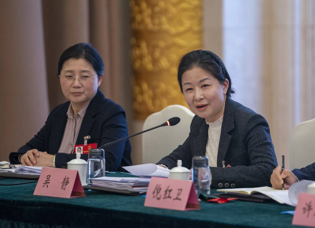 1月27日,十堰市代表团审议省政府工作报告,省人大代表吴静(右)发言。(湖北日报全媒记者 魏铼 摄)