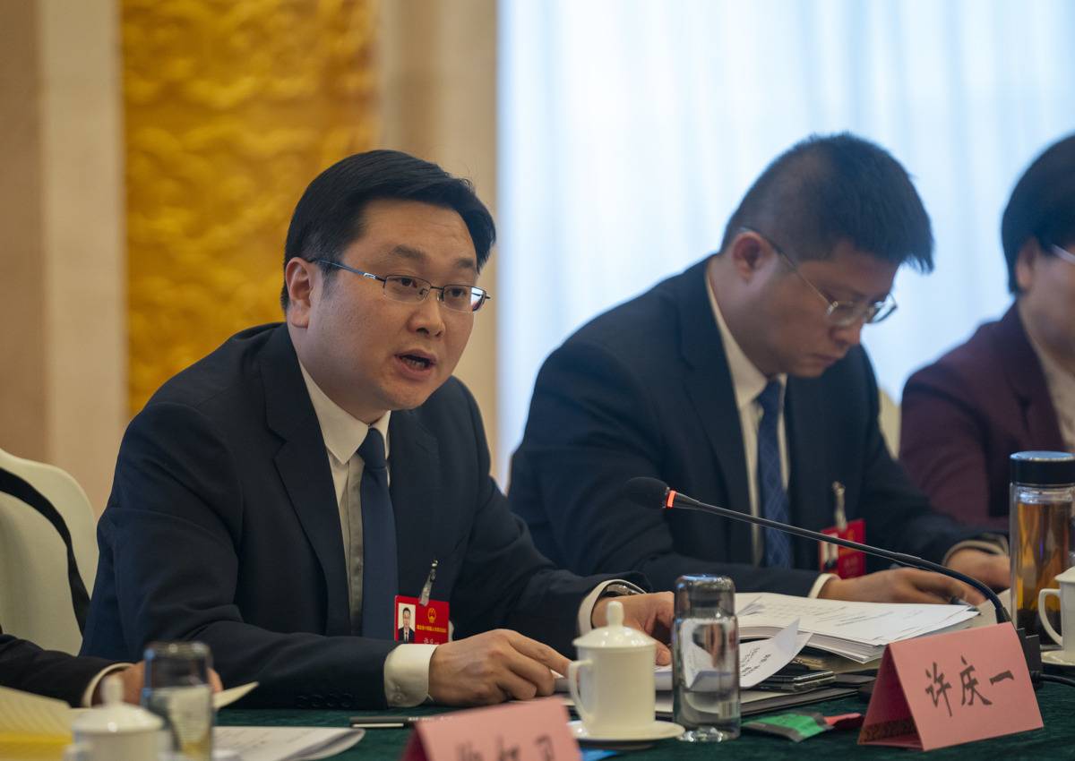 1月27日,十堰市代表团审议省政府工作报告,省人大代表许庆一(左)发言。(湖北日报全媒记者 魏铼 摄)