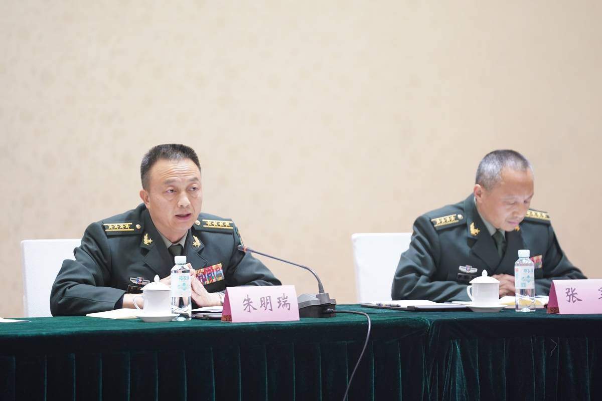 1月27日,驻鄂解放军和武警部队代表团审议省政府工作报告,省人大代表朱明瑞(左)发言。(湖北日报全媒记者 魏铼 摄)