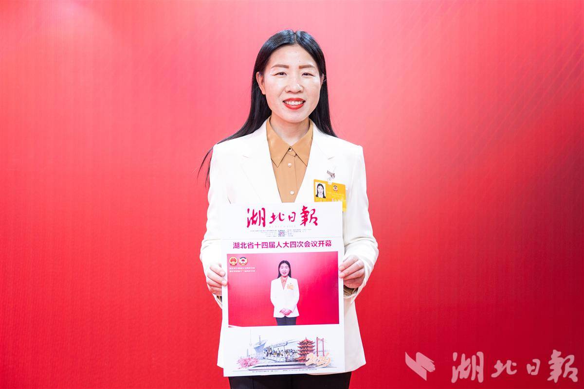 1月27日,在洪山礼堂湖北日报展区,一名委员与自己的“头条”照片合影。(湖北日报全媒记者 任勇 摄)