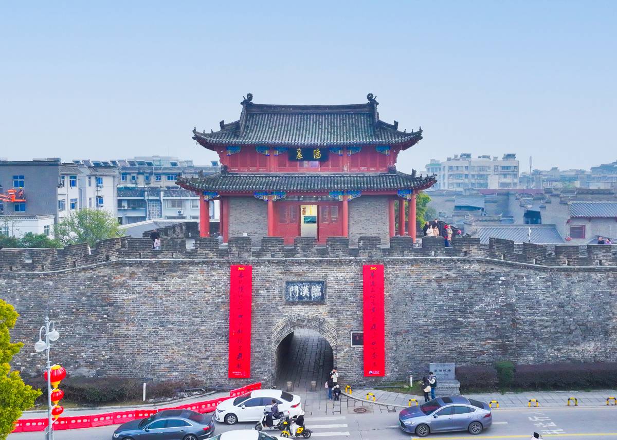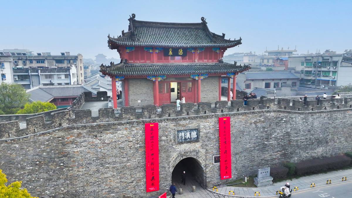 近日,襄阳古城临汉门悬挂起巨幅春联,红彤彤的联幅与城楼相映成趣,成为古城最抢眼的新春景观,吸引市民纷纷驻足拍照留念。