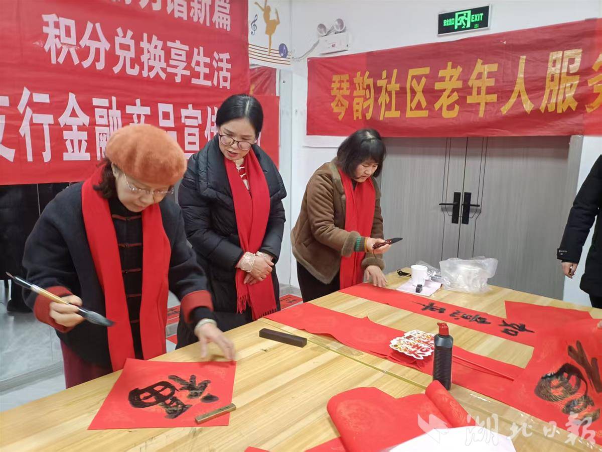 现场还设置了互动游戏,居民纷纷上场,笑声不断。志愿者李继红和张先云老师铺纸研墨,写下一副副春联,将吉祥的祝愿送到居民手中。