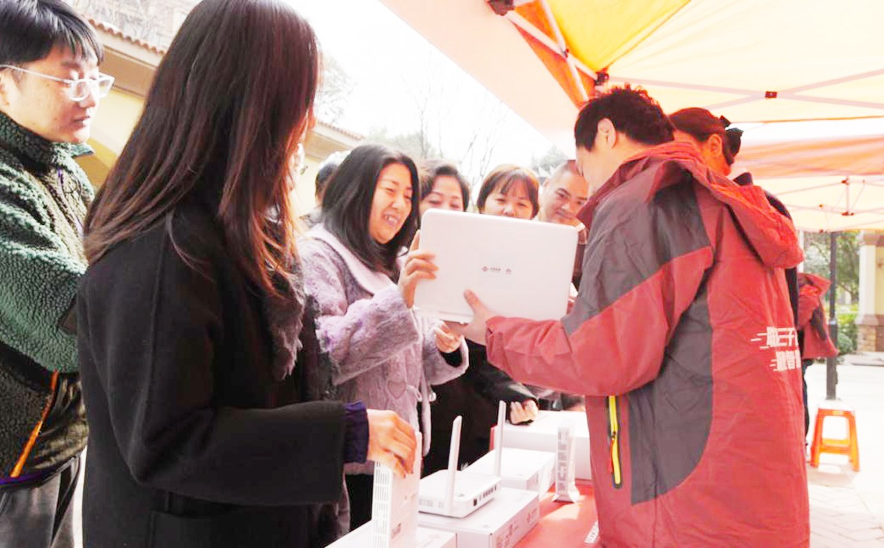 在武汉万科高尔夫城市花园小区,市民现场尝鲜联通万兆新应用。