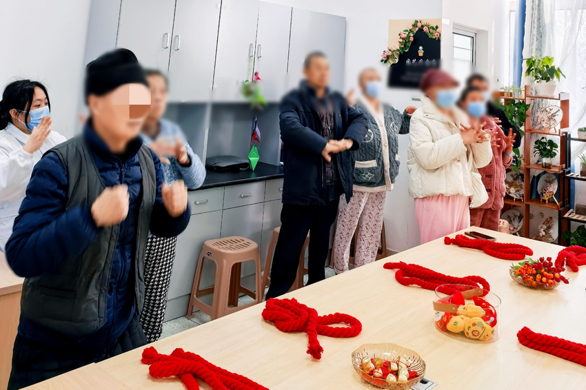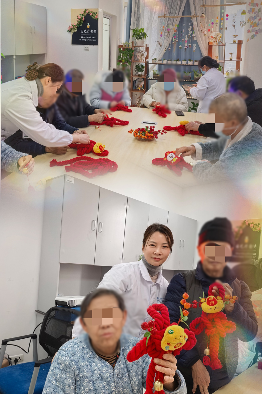 一缕红绳,结缘安康。中国结寓意团结、祥和与坚韧。一根红绳,缠绕成结,也编织着对健康、团圆的美好向往。在医护人员和志愿者指导下,患者和家属亲手尝试编织中国结。