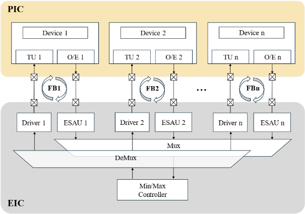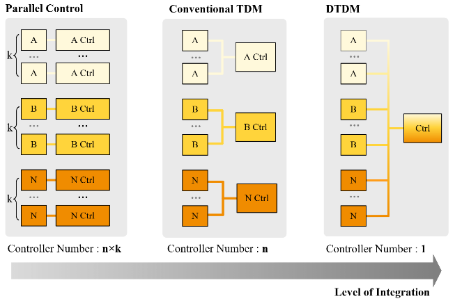 然而,现有的控制架构难以同时兼顾集成度与异质兼容性。传统的并行控制架构采用“单器件-单控制器”模式,其面积与功耗开销随集成规模呈线性增长,成为制约高密度光电融合集成的“功耗墙”与“面积墙”。常规的时分复用(TDM)技术虽然有效降低了控制器数量,但仅局限于同质器件(如多个相同的微环)的轮询控制,无法应对复杂光电系统中物理特性截然不同的异质器件协同调控需求。如何在极受限的芯片资源下,实现单一控制器对不同类型光器件的高效协同管理,是光电融合芯片领域亟待突破的关键技术瓶颈。