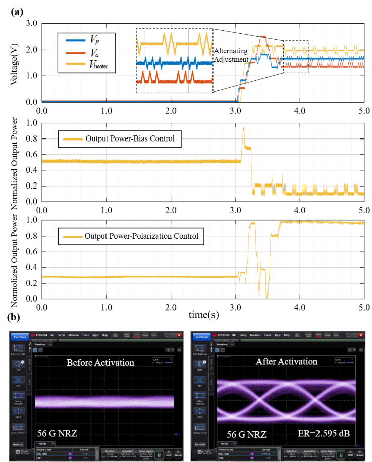高速链路传输能力:实测结果表明,在开启协同控制后,系统支持 100 Gbps NRZ 信号的单模传输;即使在偏压与偏振双闭环同时工作的复杂场景下,依然实现了56 Gbps NRZ的稳定无误码传输,眼图清晰张开。