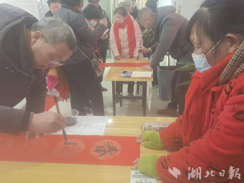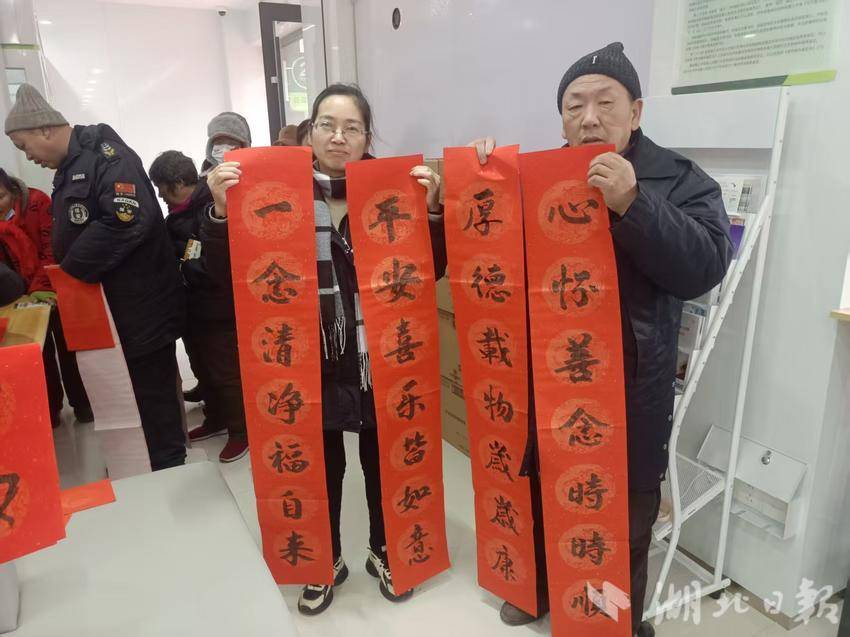 活动现场,书法老师们摆开桌椅,铺开红纸,蘸饱笔墨,神情专注地书写着一幅幅春联。他们笔走龙蛇,行云流水间,一幅幅寓意吉祥的春联跃然纸上。“一帆风顺年年好,万事如意步步高”“天增岁月人增寿,春满乾坤福满门”“福星高照全家福,春光耀辉满堂春”等充满喜庆和祝福的话语,在笔尖流淌,传递着对新一年的美好期许。