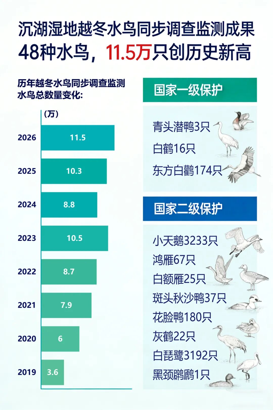 沉湖国际重要湿地作为长江中下游湿地群的重要组成部分,是越冬水鸟的 “天然庇护所”。此次越冬水鸟数量破纪录,既是对沉湖湿地生态保护工作的肯定,也体现了其作为国际重要湿地,在全球候鸟迁徙路线中的关键地位,更为后续的生态保护、湿地管理提供了宝贵的科学数据支撑。