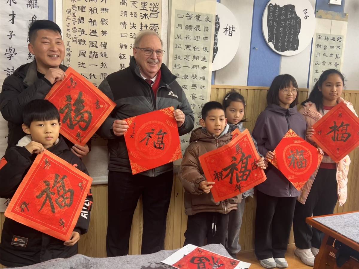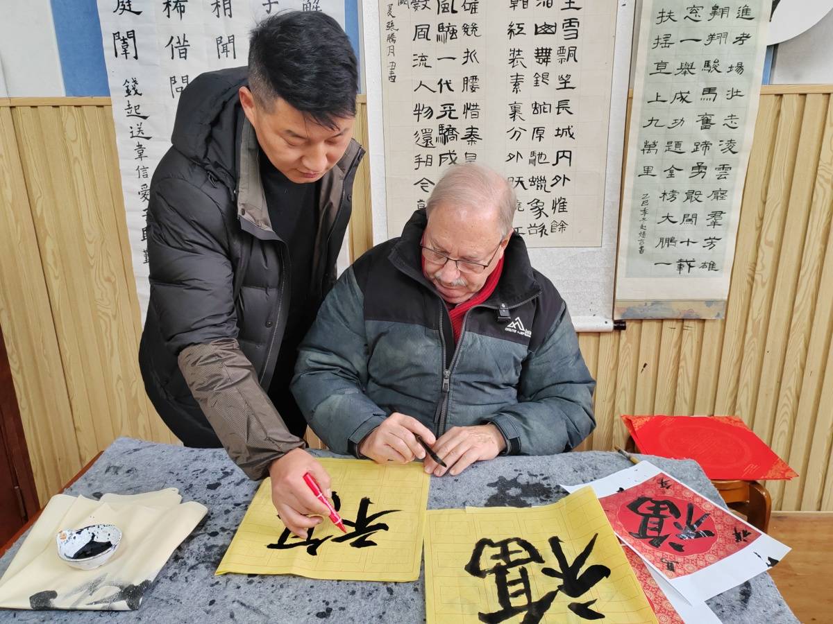 尹桂平教汤姆叔叔写“福”字。(湖北日报全媒记者 张泽牧 摄)