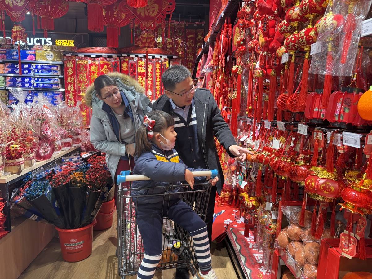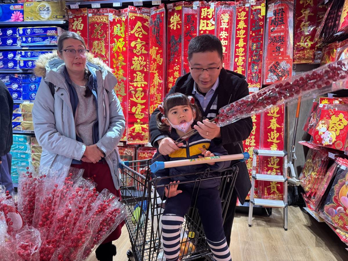 陈腾飞和Madelief带着女儿陈洛宁选购新年饰品。(湖北日报全媒记者 汪蕾 摄)