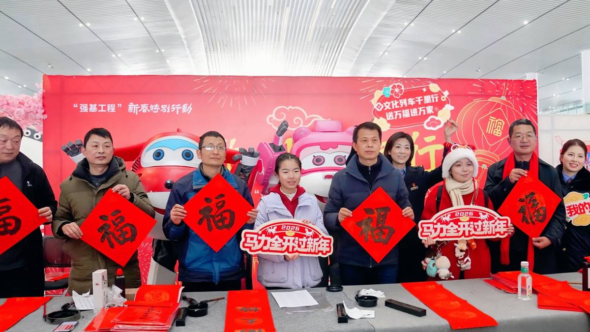 2月2日,2026年春运首日,“文化列车千里行·送万福进万家”主题活动在襄阳三大火车站同步开启。襄阳东站候车大厅内,8名书法名家挥毫泼墨,数百幅饱含墨香的“福”字跃然纸上。旅客们纷纷围聚观赏、争相祈福,候车时光满是年味儿。