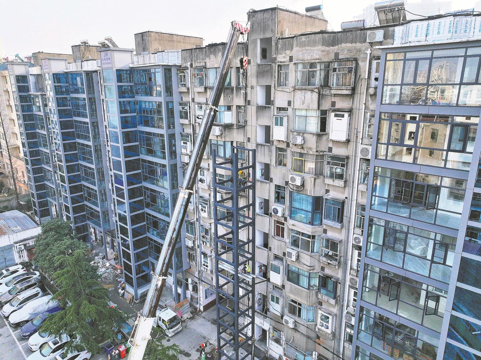 2月1日,在位于樊城区火炬路的市政管理处家属院里,工人为旧楼加装电梯。
