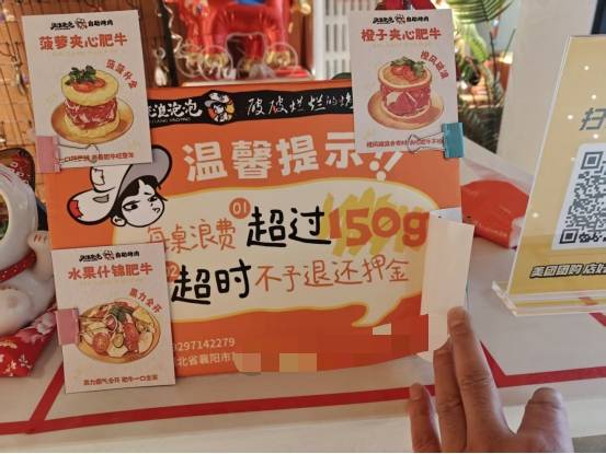服务员提醒:用餐时间2小时,食物浪费不超过150克,押金原路退回。