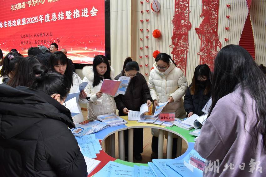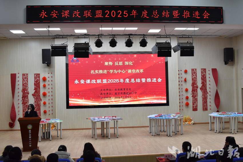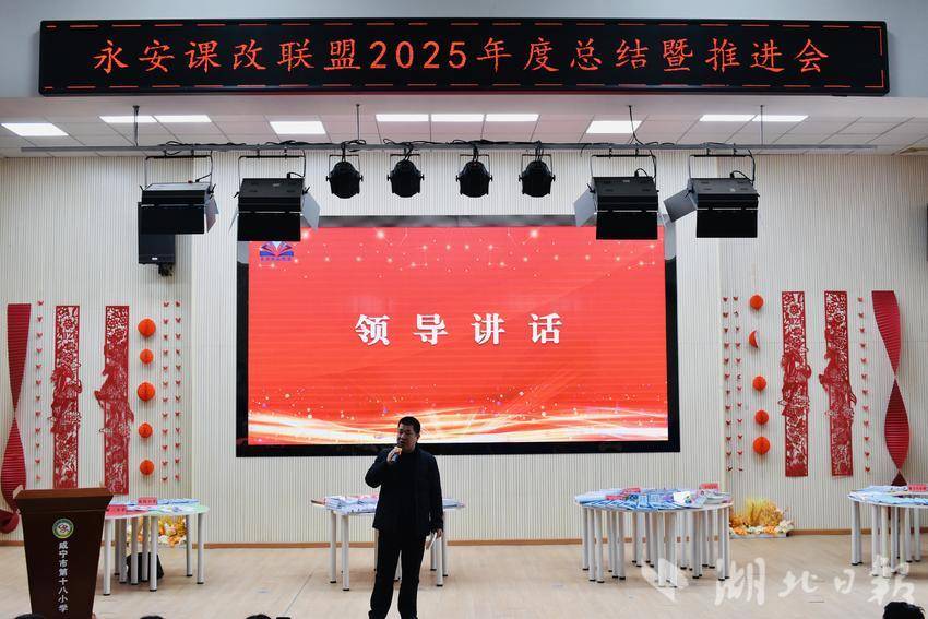 湖北日报客户端讯(通讯员张芬、彭娟)岁暮收官凝共识,笃行致远启新程。2026年2月3日上午,永安课改联盟2025年度总结暨推进会在咸宁市第十八小学报告厅举行。区教育局党组副书记沈海林、教研室副主任吴平、永安教育总支管理员、业务员,以及联盟八校校长和骨干教师代表齐聚一堂,复盘教改实践历程,共商育人提质策略,为年度课改工作画上圆满句号,为深化改革锚定清晰航向。