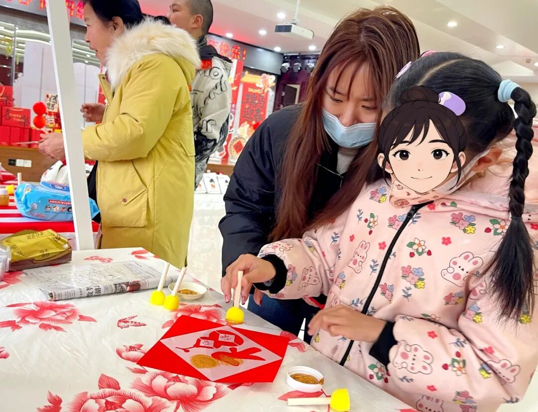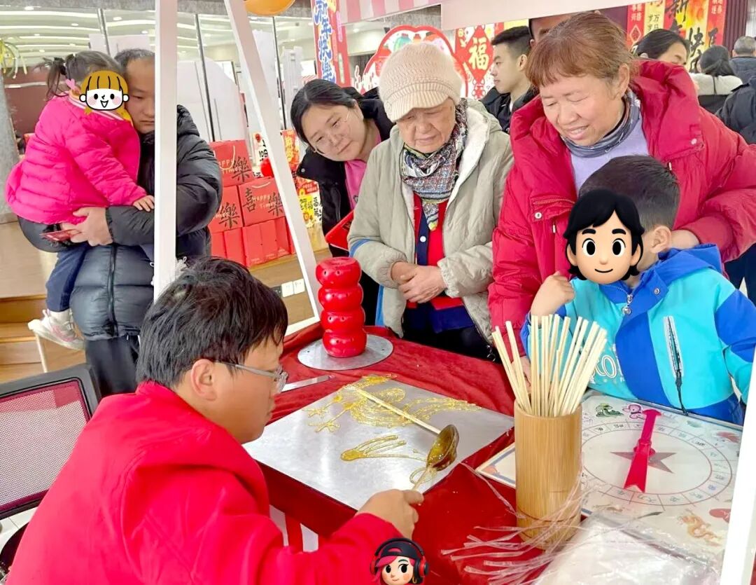 庙会现场热闹非凡,“春联送福”处墨香扑鼻,书法老师挥毫泼墨;“拓福迎春”处,孩子们与家长协作,将吉祥文字拓印在红纸上,体验传统技艺。“非遗糖画”摊位前围满了孩子,晶莹剔透的糖画在传承人手中诞生,甜蜜的滋味在现场弥漫。套圈、投壶等经典游戏区更是欢笑不断。