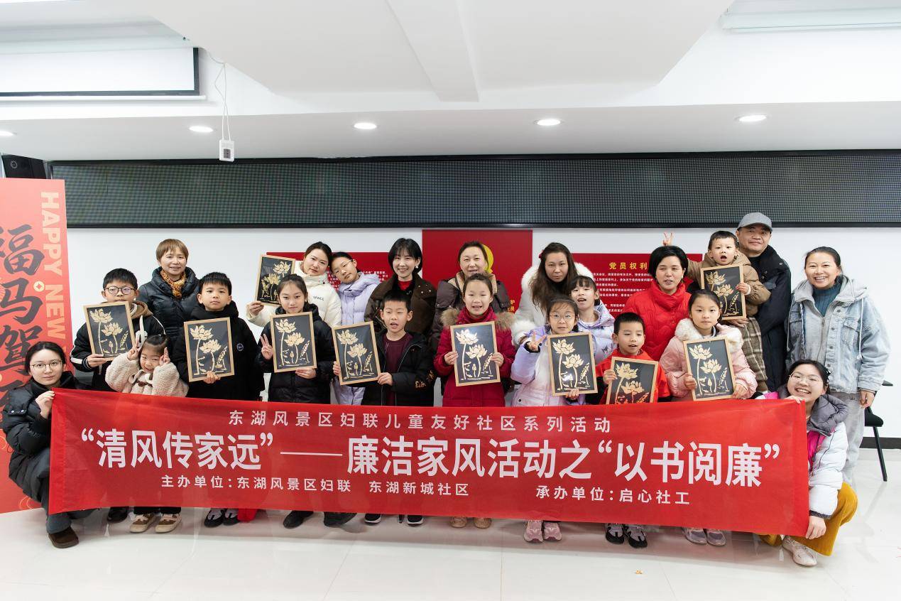 湖北日报讯(通讯员朱曼婷、万莉)为深入培育儿童友好社区文化土壤,弘扬清正廉洁的家风传统,农历新年临近之际,1月31日,东湖风景区妇联联合东湖新城社区及启心社工,共同举办清风传家远——廉洁家风系列活动之“以书阅廉”亲子活动。东湖新城社区30组亲子家庭共计52人齐聚社区党员群众服务中心,通过故事聆听、互动体验与手工创作,将“廉洁”种子播撒进孩子心田,以清廉家风迎接新春佳节。