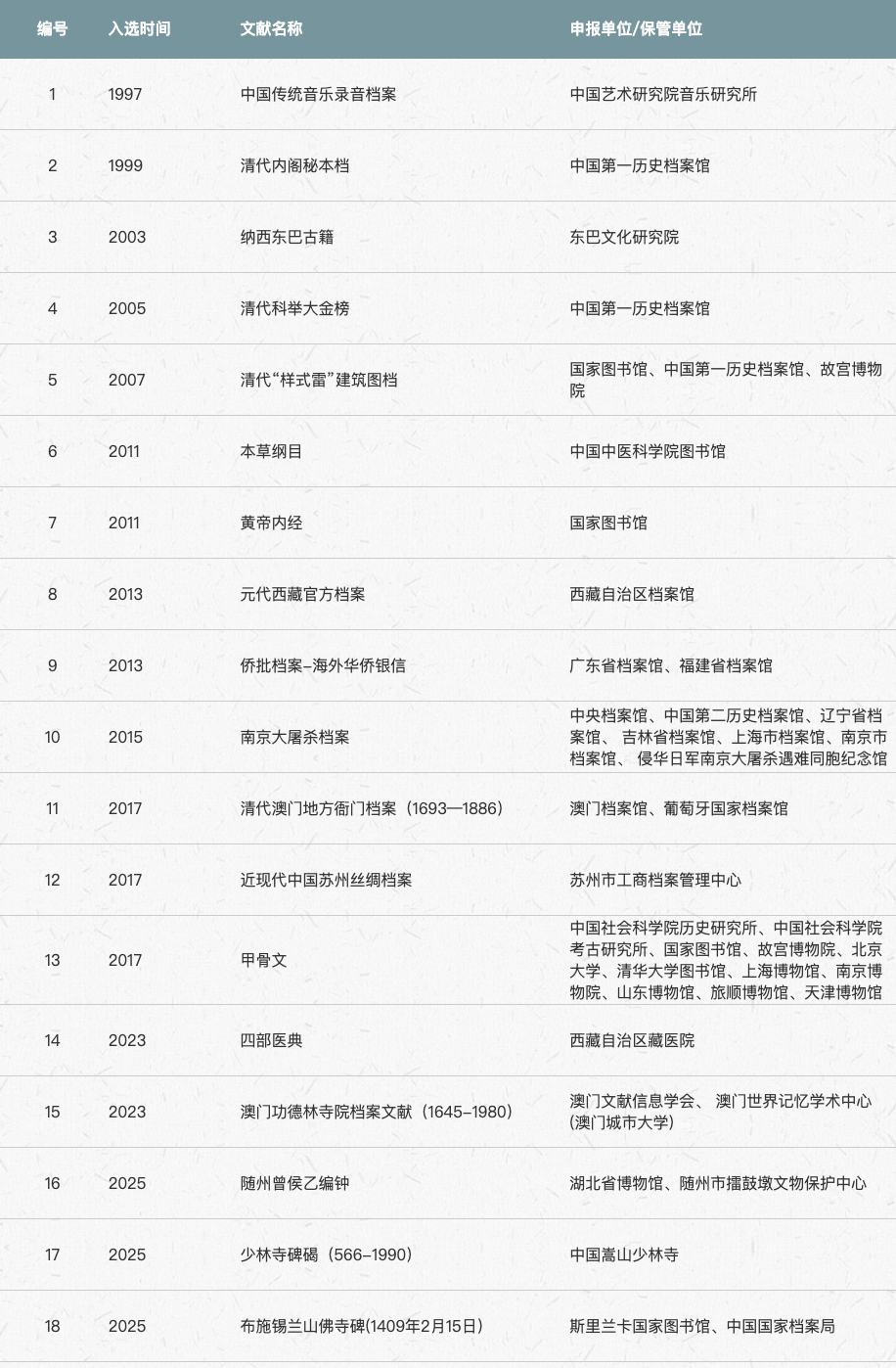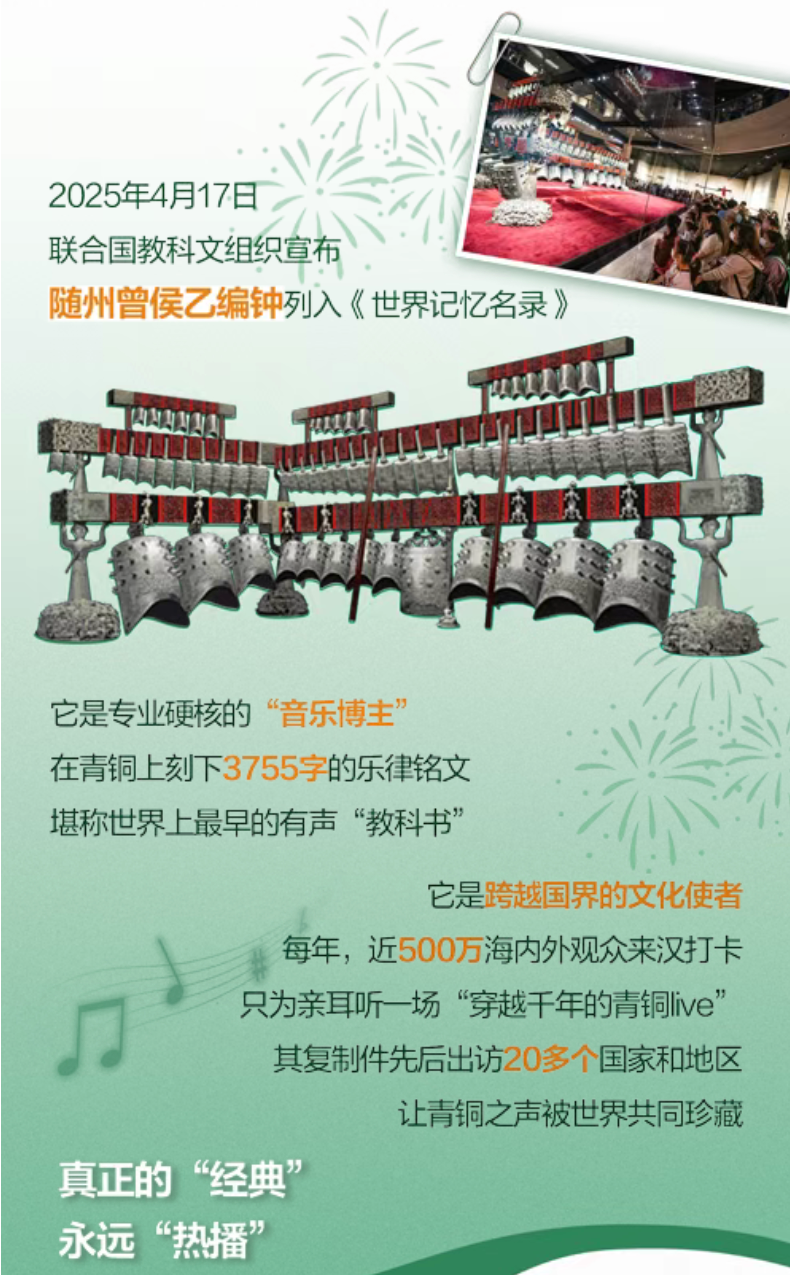 2025年4月17日,湖北省博物馆馆藏镇馆之宝“随州曾侯乙编钟”成功入选联合国教科文组织《世界记忆(国际)名录》,成为中国18项《世界记忆(国际)名录》文献遗产项目之一。