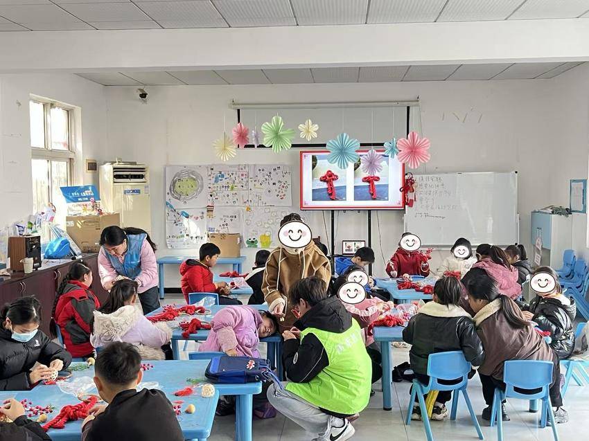 在中国结制作环节,社工将红绳、剪刀、装饰珠等材料逐一发放给孩子们,并手把手示范中国结装饰的制作步骤:穿线、打结、调整、固定、点缀装饰珠,每一个步骤都耐心讲解、反复指导。