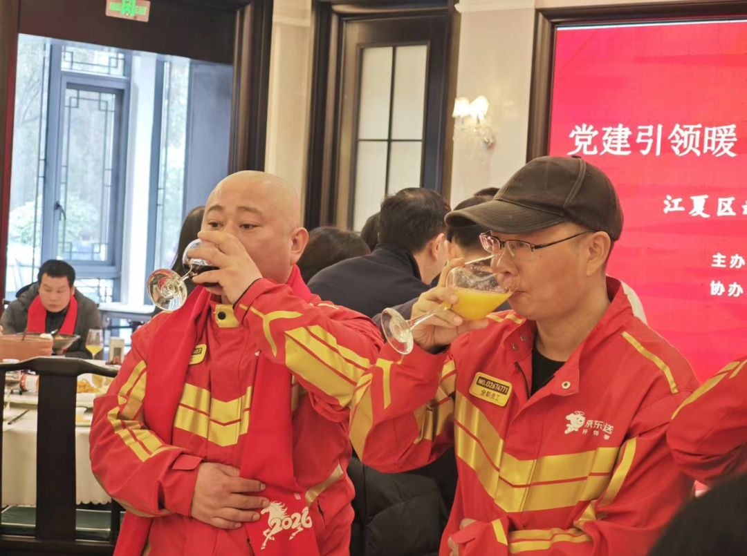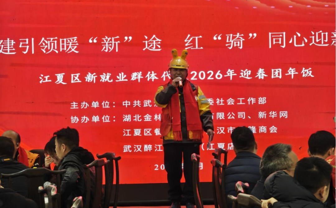 中午12时,“年饭一家亲”活动温情启幕。区委社会工作部与新华网联合摄制的宣传片《温暖一程・美好有我》暖心上线,熟悉的友好场景一一呈现,新就业群体穿梭街巷的身影触动全场。区委社会工作部副部长致辞时动情表示:“大家风雨无阻守护城市的烟火气,这桌团年饭是‘娘家人’的关怀与感恩。”“红骑侠”志愿服务队队员张小强拥抱工作人员,哽咽道:“感谢‘娘家人’让异乡人变成有归属感的‘江夏人’,这饭吃着香、心里暖!”朴实话语引发全场热烈掌声。随后,美团骑手夏云演唱《拜年歌》,欢快旋律烘托浓厚年味。活动现场,区委办公室副主任、区委社会工作部部长为获得“百花奖”大奖的新就业群体颁发了奖杯和证书,并致敬新就业群体的奉献精神。当《无名的人》旋律响起,新就业群体代表与工作人员共同唱响“离家的人啊,我敬你一杯酒,敬你的沉默和每一声怒吼”,歌词道出奋斗者的坚守担当,现场氛围达到高潮。