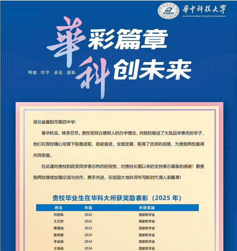 喜报显示,襄阳四中毕业生邓楚枫、王芷妍,襄阳五中毕业生龚怡诺、付名扬等人,分别获得了2025年度国家奖学金、国家励志奖学金、华中科技大学科技创新奖学金、华中科技大学三好学生等荣誉。