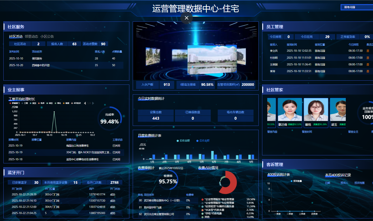 依托“1-3-N-1-X”数字化体系,构建以客户需求为导向的服务模式。通过“i丽岛APP”实现智慧缴费、报修、购物等功能,业主线上办事覆盖率达85%。运用EMS系统实现设备、工单、人员等线上管理,并部署AI监控系统,实现周界预警、垃圾满溢监测等功能,以数字手段保障居住安全与便利。