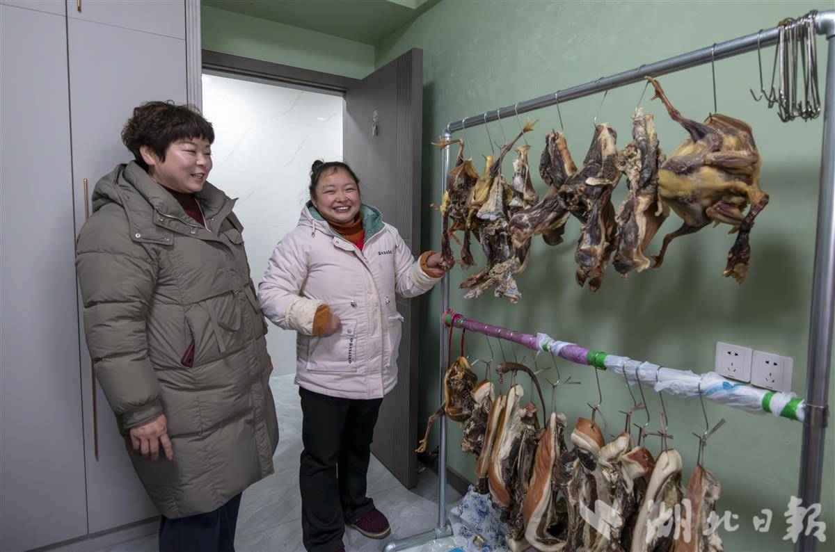 张玉玲(右)今年在房子重新装修一新,过年的腊货已置办齐全。