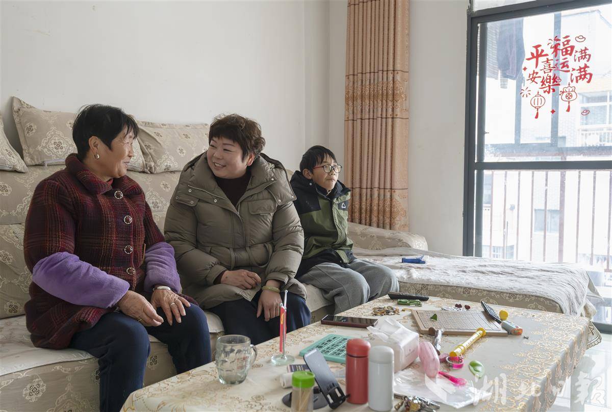 金亚利书记(中)与村民李荣花(左)聊天,她儿子儿媳都在上海打工,两人月收入都超万元,李婆婆满脸笑容,诉说着如今的幸福生活。