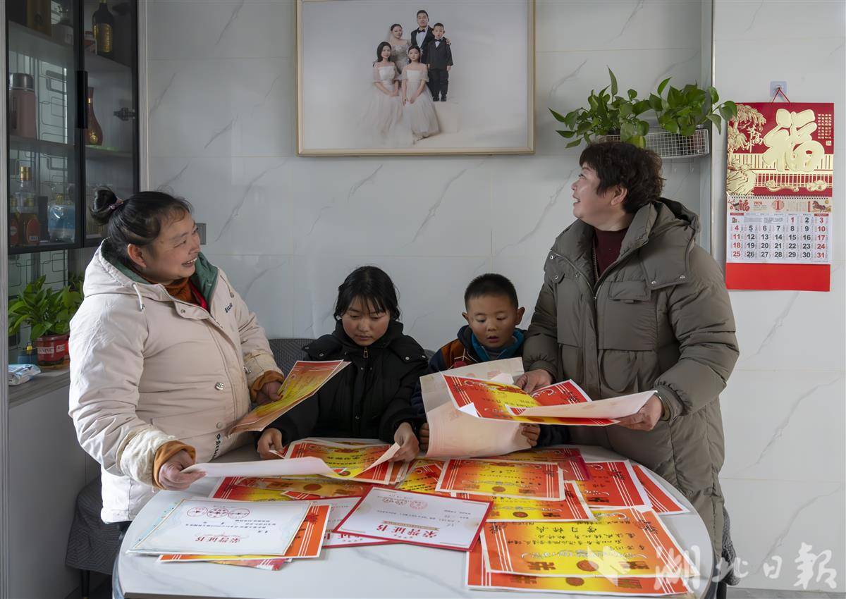 村民张玉玲(左)向社区金书记(右)汇报自家小孩的学习情况 ,并拿出一撂奖状给大家观看。