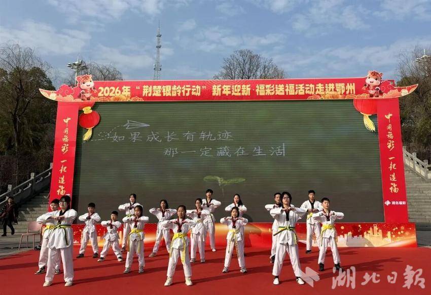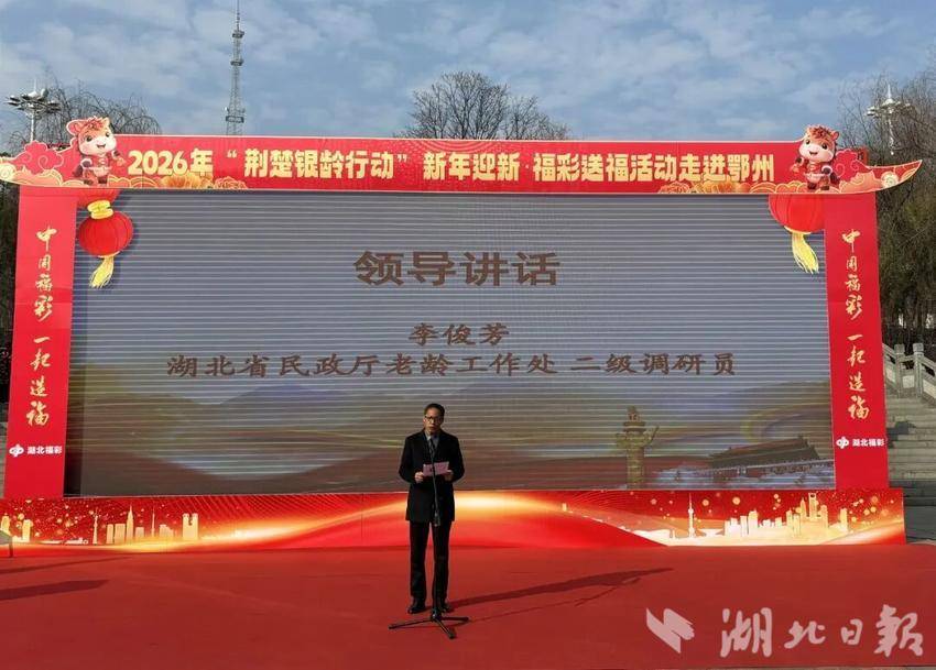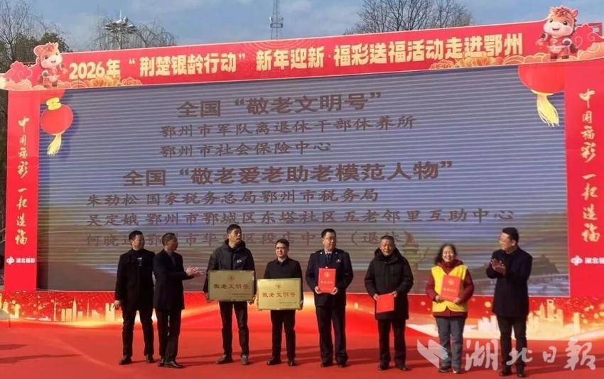 湖北日报客户端讯(通讯员邓光耀 尹丽君)立春伊始,万象更新。2月4日上午,鄂州市西山公园内暖意融融、翰墨飘香,处处洋溢着喜庆祥和的新春氛围。由湖北省民政厅、省老龄办指导,湖北省福利彩票发行中心主办的2026年“荆楚银龄行动”新年迎新·福彩送福活动在此隆重举行。这场集表彰礼赞、文艺展演、公益服务于一体的春节盛会,为老年朋友及广大市民送上了浓浓的新春祝福,也让福彩公益精神与尊老敬老风尚在吴都大地温情传递。