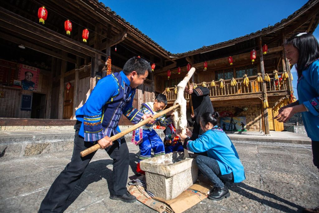 烟火气里藏乡愁,乡土市集年味足。农家乐与民俗村内,柴火灶熊熊燃烧,地道农家菜、大锅杂烩、红薯米粑粑等特色美食香气四溢,用最质朴的味道款待远方来客。喳西泰文化广场的“乡土市集”上,凤头姜、土家腊肉、干菜、藤茶等农特产品琳琅满目,游客们争相选购,把“来凤味道”带回家。打糍粑、印米粑等传统手作体验区人气爆棚,游客与市民携手协作,蒸腾的糯米香与柴火暖意交织,在欢声笑语中唤醒童年记忆,亲手制作专属“年味”。