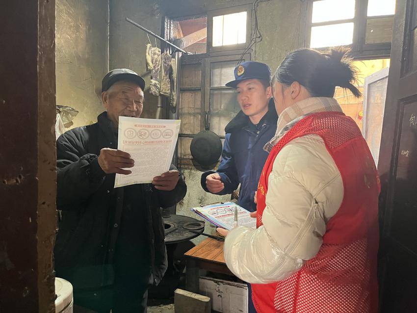 入户走访中,宣传小组带着宣传资料,走进独居老人家中,与老人亲切交谈,详细了解他们的生活起居和用火用电用气习惯。针对冬季火灾、一氧化碳中毒两类高发风险,宣传人员开展针对性宣传引导,围绕老人日常使用的煤炉、电暖器、燃气灶具等生活设备,逐项讲解安全用电、用气知识,细致演示取暖设备的正确使用方法和注意事项,耐心讲解消防安全常识,提醒老人不要在床边、沙发旁堆放易燃物品,不要私拉乱接电线,避免因疏忽引发火灾。