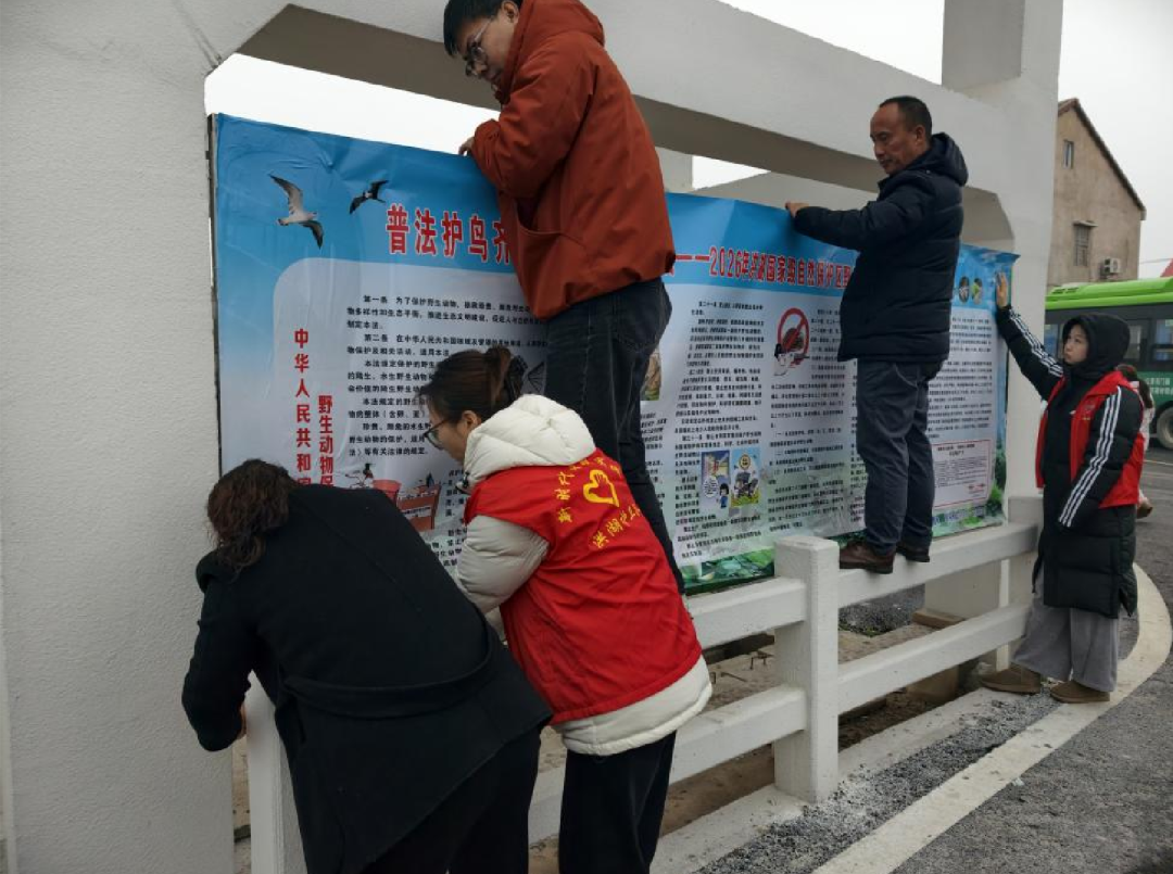 返程途经官墩村,宣讲队员冒雨更新了村口宣传栏资料。车窗外,越冬的水鸟在细雨间欢快飞舞,宛若为这场深入乡村的普法行动深情点赞。