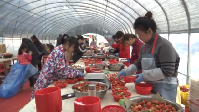 在一旁的分拣大棚内,工作人员正有条不紊地对新鲜采摘的草莓进行分拣、包装,准备发往黄冈、襄阳等周边地区的商超。