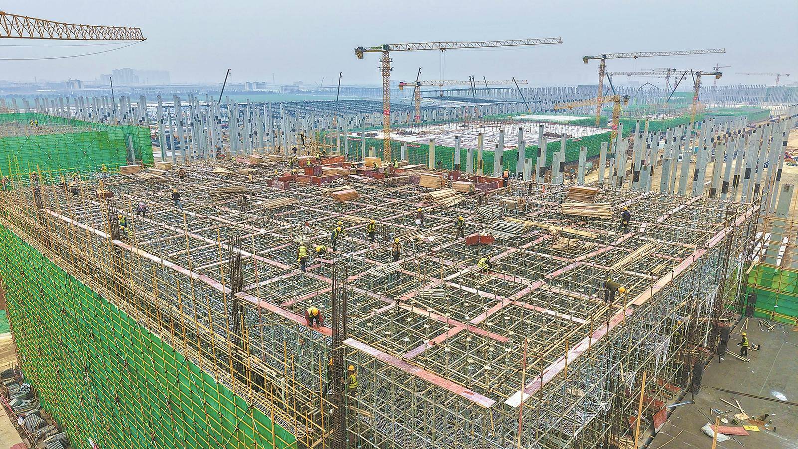 2月4日,在位于高新区的楚能新能源襄阳项目工地上,塔吊林立,工人们正忙碌施工。目前,该项目的基础施工已全面完成,部分主体结构封顶,预制柱和钢结构吊装施工全面铺开。(来源:襄阳日报