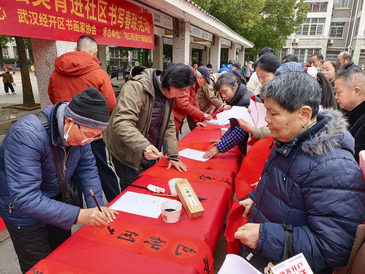 活动伊始,书法桌案前已排起蜿蜒长队。来自武汉经开区书法家协会的6位老师挥毫泼墨、笔走龙蛇,一副副寓意吉祥的春联、一个个饱满圆润的“福”字在笔下诞生。“这副‘骏马奔驰追梦远,春风浩荡送福来’写得好!印刷的春联虽方便,但手写的才有墨香,看着墨迹慢慢干,这年味才真!”居民李建新拿着刚写好的春联,一边小心晾晒一边赞叹。