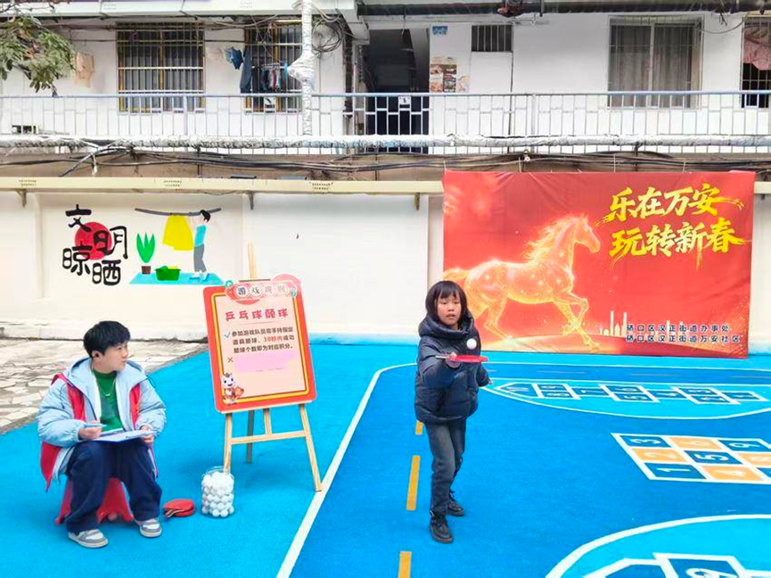 湖北日报讯(通讯员洪先胜)为丰富辖区居民文化生活,拉近邻里情谊,营造喜庆祥和的新春氛围,2月4日,武汉市硚口区汉正街道万安社区党委携手社区工会联合会,在崇德里3号3楼办公区平台开展“乐在万安 玩转新春”迎新春趣味闯关活动,辖区居民欢聚一堂,在趣味互动中喜迎新春、共叙邻里情。
