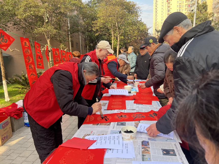 舞台之外,互动区域同样热闹非凡。佰穗惠民苑老年人服务中心组织志愿者现场书写春联,“龙腾盛世千家喜,马跃新春万户欢”等一幅幅饱含美好祝愿的春联,被居民们开心地领取。