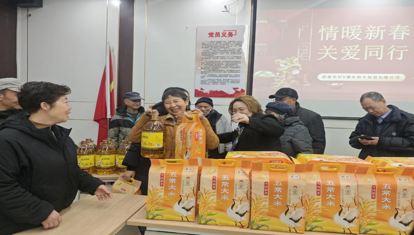 湖北日报客户端讯(通讯员徐娟芬、庞腾佳)近日,洪山区人大代表、湖北和丰·国酒公司总经理沈琼联合湖北省国酒茅台文化研究会、武汉市京江贸易有限公司等单位,走进卓刀泉街道虎泉社区,开展“情暖新春·关爱同行”慰问活动,为社区57户困难家庭送上大米、食用油等生活物资,并致以诚挚的新春祝福。