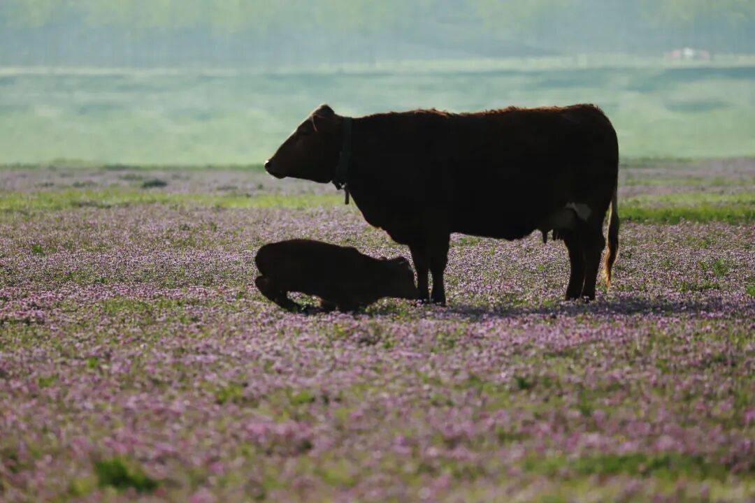 2025年4月6日,监利王巷闸长江故道。小牛犊以跪伏的姿势,趴在母牛面前,行叩拜大礼。黑色的身影如版画,刻在大地上,每一个生命都值得敬畏,每一个善举都值得尊重,每一次感动都应该被铭记。